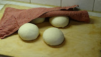 Miután jól kidagasztottuk a tésztát, 4 egyenlő részre osztjuk, meggömbölyítjük őket. Letakarjuk tiszta konyharuhával, és kb. 30 percig kelesztjük így a tésztát.