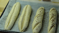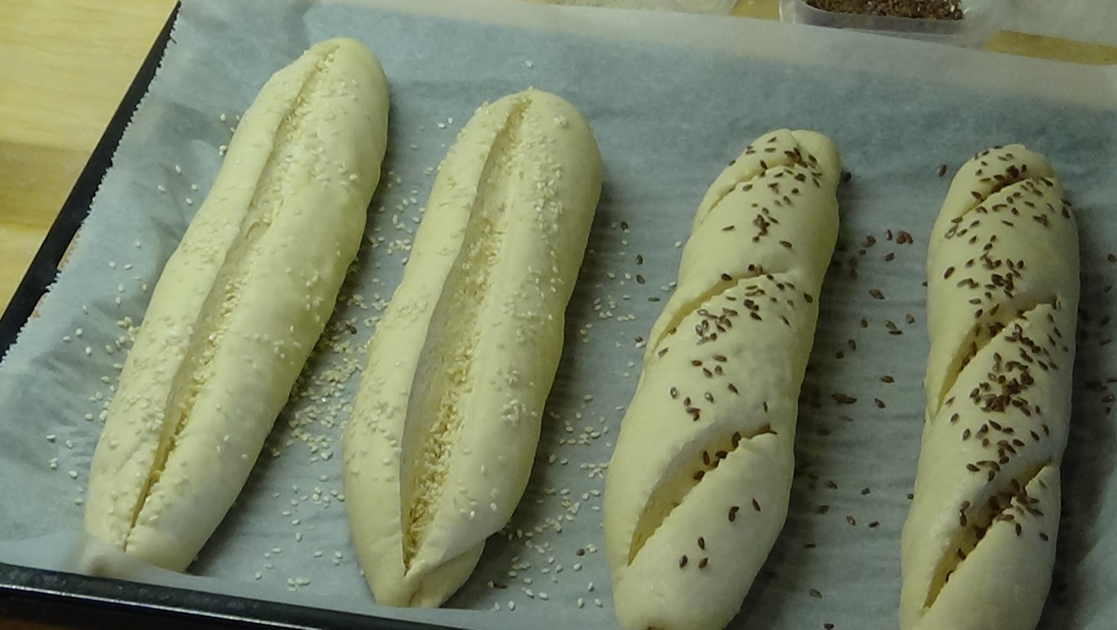 Miután újra megkeltek a bagettek, történik a díszítés. Jól lespricceljük vízzel a bagettek tetejét, és egy éles késsel bevágjuk őket. Én lenmaggal és szezámmaggal szórtam most meg a tetejüket, de mehet rájuk bármilyen más mag is. Ezután még egyszer jól lespricceljük őket vízzel. Mehet a tepsi a sütőbe.