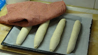 Miután megkelt történik a bagettek megformázása, melyet a videóban bemutatok részletesen, hogyan történik. 4 db bagettet készítünk, és sütőpapíros tepsire fektetjük őket. Letakarjuk a tepsit konyharuhával, és így is kelesztjük még 30 percet.